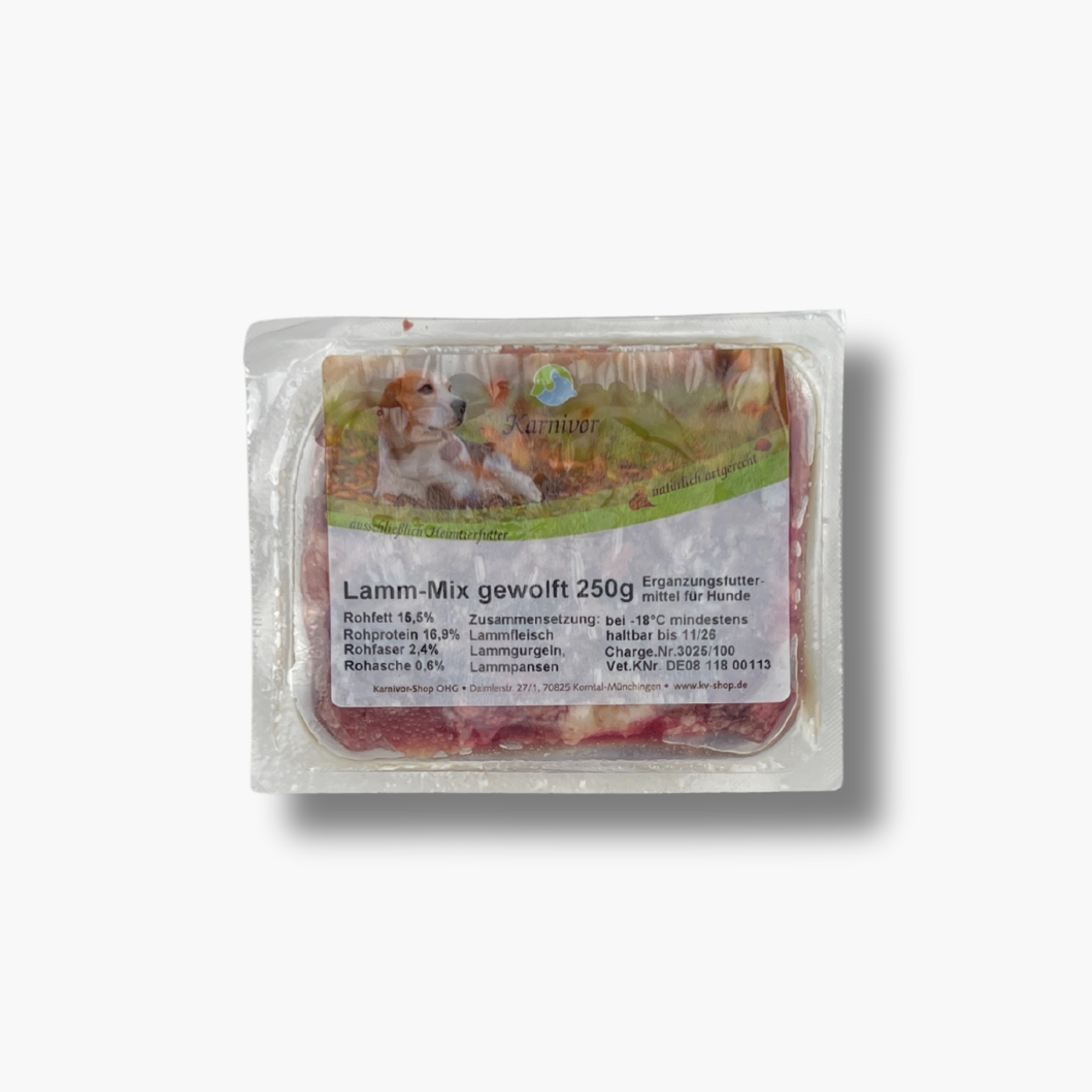 Unser Lamm-Mix besteht zu 50% aus Muskelfleisch und 50% Innereien (Lammpansen, Lammgurgel) vom Lamm. Durch diese ideal kombinierte Zusammensetzung erhält Ihr Hund wichtige Vitamine und Mineralien für einen aktiven Alltag. Der Lamm-Mix ist ein wahrer Energielieferant. Durch die gute Verträglichkeit ist das BARF-Futter zudem für Hunde mit Allergien geeignet.