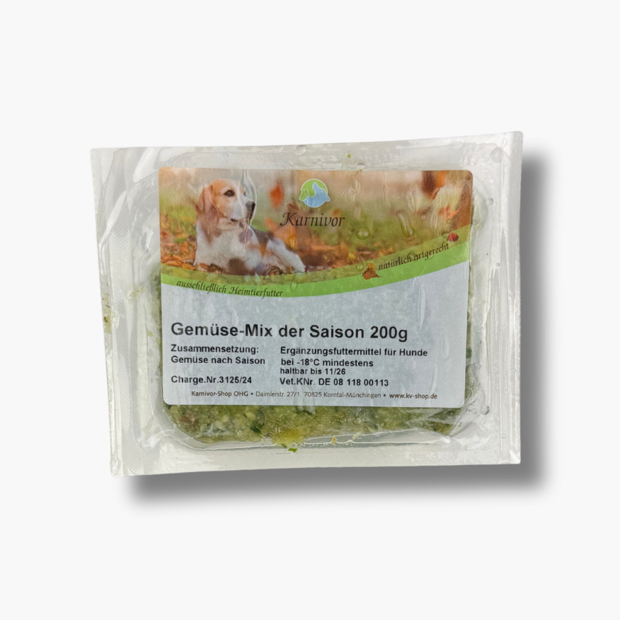 Frisches Gemüse der Saison, wie z.B. Broccoli, Blumenkohl, Zucchini, verschiedene Salate, Fenchel, Spargel und Sellerie – alles in Marktqualität. So kann Ihr Hund von vielen wichtigen Vitaminen profitieren. Zudem beinhaltet der Gemüse-Mix der Saison hochwertige Salate wie beispielsweise Batavia, Novita, Feld und Ackersalat. Wichtig ist, dass Sie beim Füttern mit unserem Gemüsebrei immer eine Fettquelle hinzugeben, wie z.B. ein Esslöffel Öl, Quark, Joghurt oder Ei. So ermöglichen Sie, dass der Hund fettlösliche Vitamine E, D, K und A besser aufnehmen kann. Besteht aus 75% saisonalem Gemüse und 25% Äpfeln.