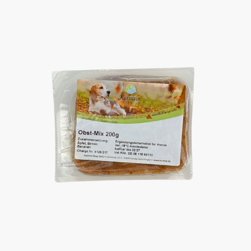 Unser Obst-Mix besteht aus 40% frischen Äpfeln, 40% Birnen und 20% Bananen in Marktqualität. Sie können Ihrem Hund mit der leckeren Vitaminbombe etwas Gutes tun. Vor allem liefern unsere frischen Äpfel jede Menge wertvoller Inhaltsstoffe wie beispielsweise Vitamin C, Vitamin B, Kalium, Kalzium, Phosphor und Eisen. So können Giftstoffe optimal im Körper Ihres Hundes abgebaut werden. Die Bananen im Obst-Mix sind zusätzlich reich an Vitamin B6. Ein köstliches Futter, welches verschiedene Prozesse im Hundekörper fördert und Abwehrkräfte unterstützt.
