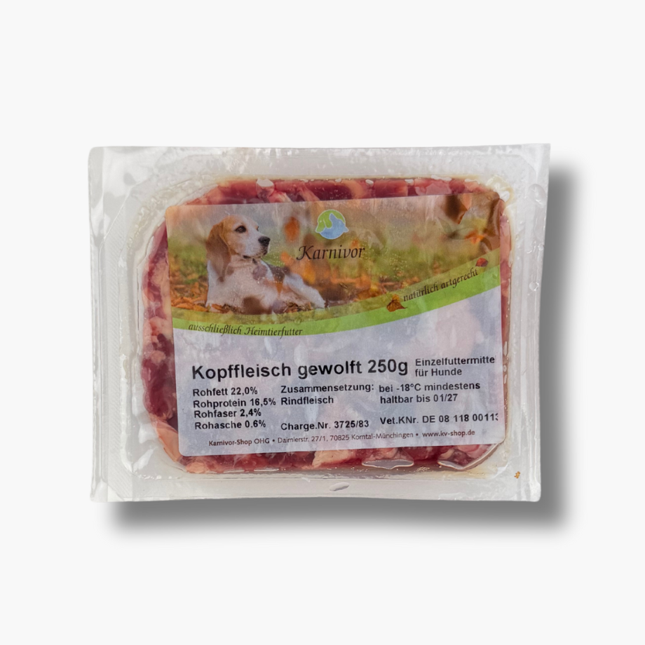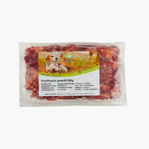 Das Kopffleisch vom Rind bietet dem Hund ausreichend Proteine, Vitamine, Spurenelemente und Mineralien. Durch seine Zusammensetzung ist es ein idealer Energielieferant für aktive Hunde und wird sehr gerne verfüttert. Ihr Hund bekommt nach dem Rennen, Toben und Spielen wertvolle Proteine und einen hohen Fettanteil. So können die Energiereserven mit diesem BARF-Futter wieder aufgefüllt werden und Ihr Hund ist bereit für neue Abenteuer.