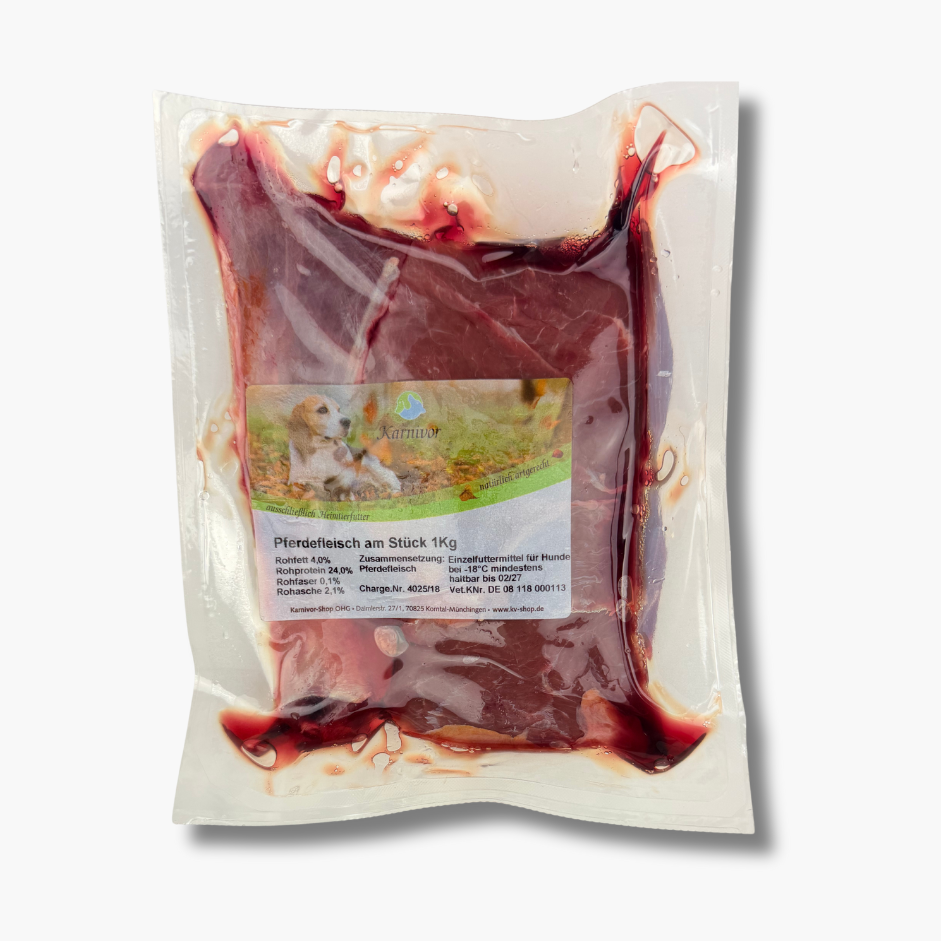 Das Pferdefleisch ist am Stück belassen und kann daher für die BARF-Fütterung selbst portioniert werden. Das Pferdefleisch zeichnet sich durch seinen geringen Fett- und Cholesteringehalt aus. Zudem hat es viel Eiweiß und ist gut verträglich. Es lässt sich daher ideal bei einer Ausschlussdiät einsetzen. So können Sie überprüfen, ob Ihr Hund an einer Lebensmittelunverträglichkeit leidet. An Allergien leidende Hunde können dieses Fleisch gut verdauen. Das Pferdefleisch ist in handgroße Stücke geschnitten. 1 kg-Portionen sind gewöhnlich in 2 - 4 Portionen tranchiert.