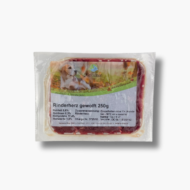 Der Herzkranz des gewolften Rinderherzens wurde entfernt, wodurch dieses BARF-Fleisch einen geringeren Fettgehalt besitzt. Zudem hat es einen hohen Protein- und Tauringehalt und versorgt Ihren Hund und seine Muskeln somit mit genügend Energie für einen abenteuerreichen Tag. Das Herz ist ein guter Vitamin B12 und B5 Lieferant – so ist Ihr Hund nicht müde und bleibt gestärkt. Zink und Kalium machen das Gesamtpaket perfekt.