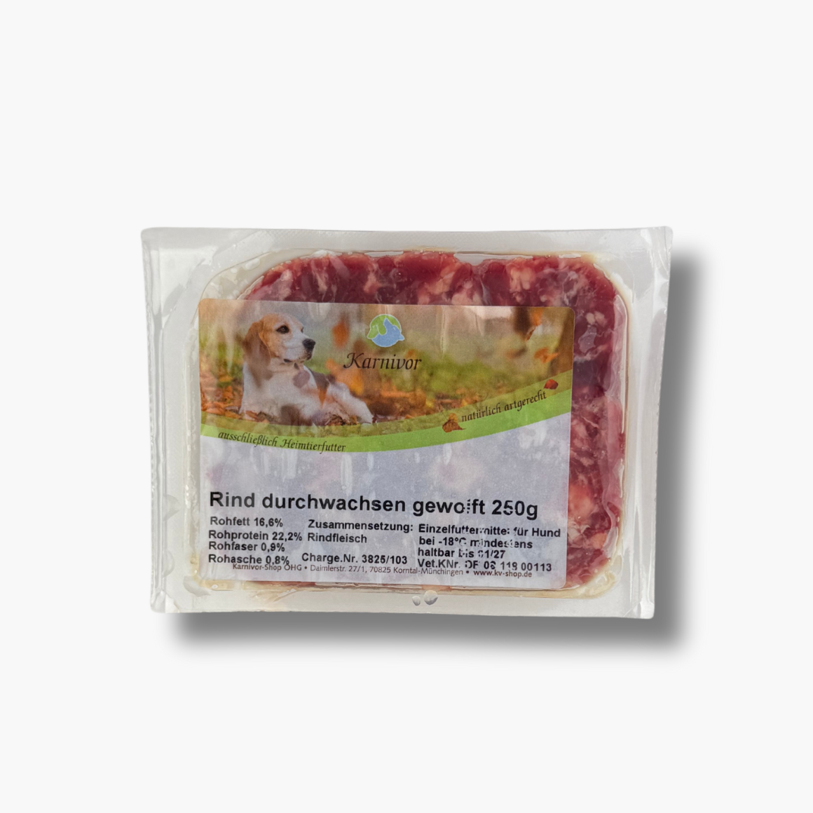 Das durchwachsene Rindfleisch hat einen höheren Fettanteil als mageres Rindfleisch. So bildet dieses Fleisch eine hervorragende Energiequelle für junge und aktive Hunde sowie Senioren, die sich noch viel bewegen. Mit diesem Fleisch geben Sie Ihrem Vierbeiner alle wichtigen Mineralien und Vitamine für einen aktiven Alltag voller neuer Entdeckungen.